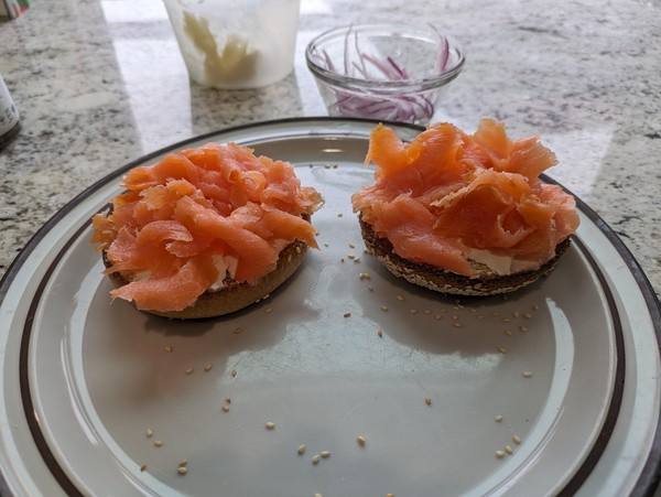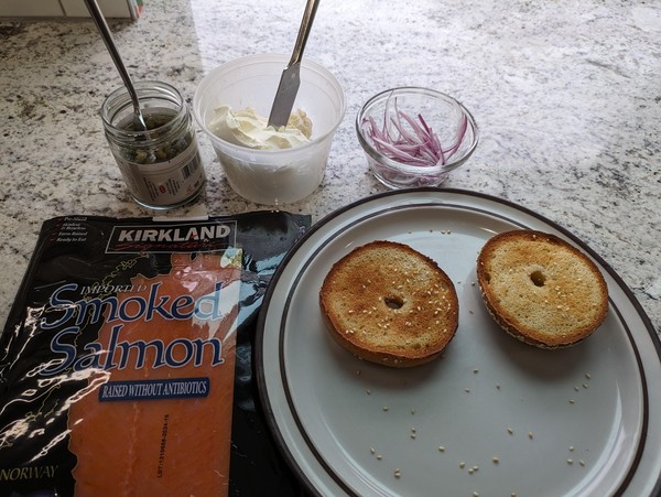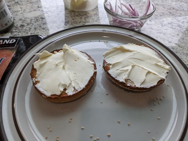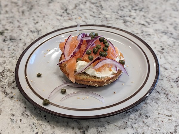 Cream cheese schmear on a toasted bagel, topped with smoked salmon, capers, and red onion