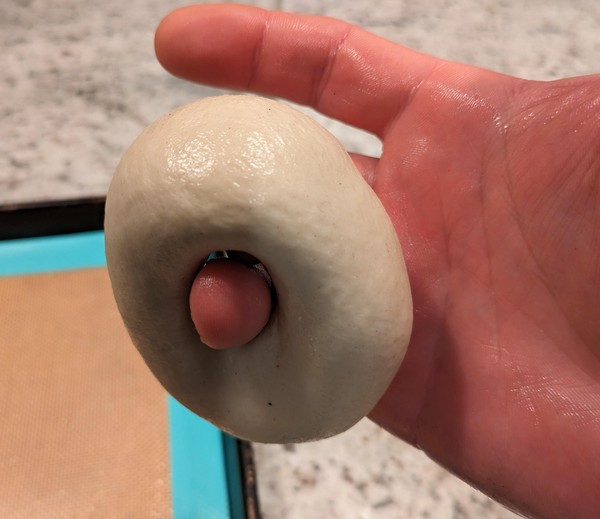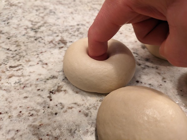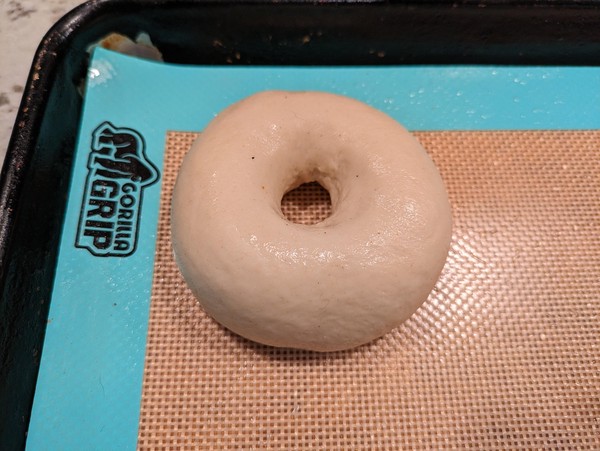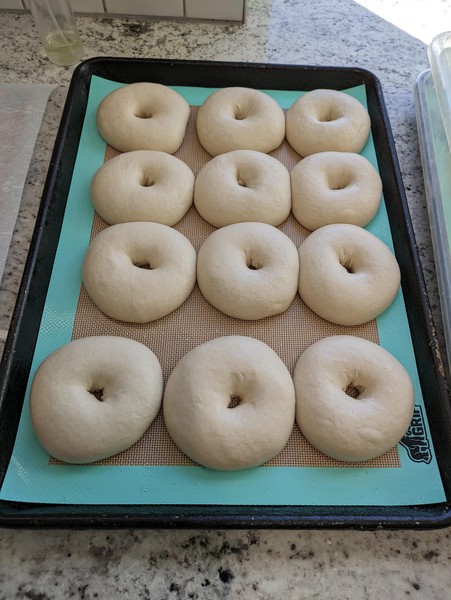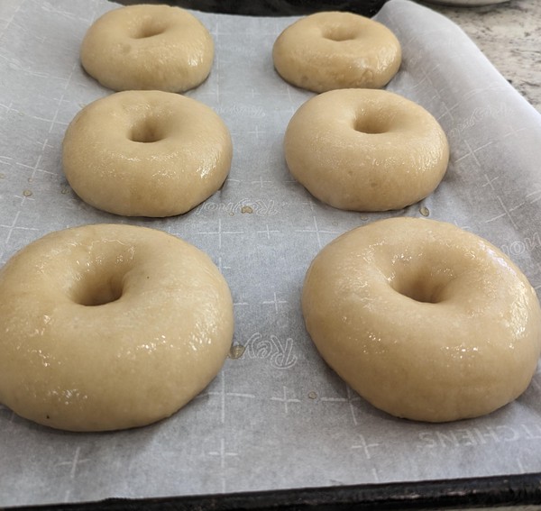 - Gently pick up each bagel and fix shape. They flatten and spread out a bit, so perk them back up