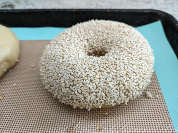 - Use strainer to move each bagel to the sheet pan, flipping right side up