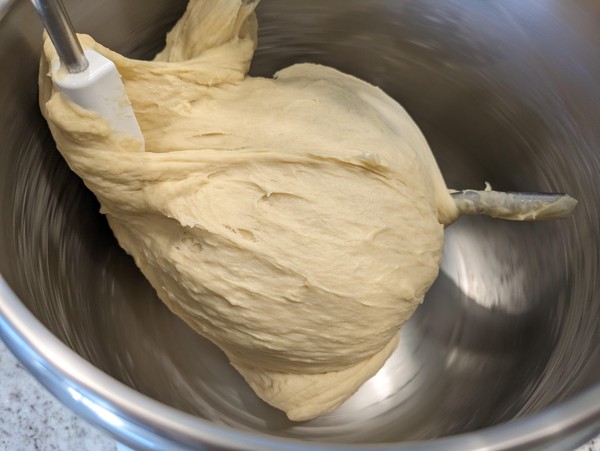 - Run mixer for 10 minutes on low speed, then cover and let rest for 5 minutes. Check for windowpane. Repeat the mix and rest cycle until dough passes the windowpane test