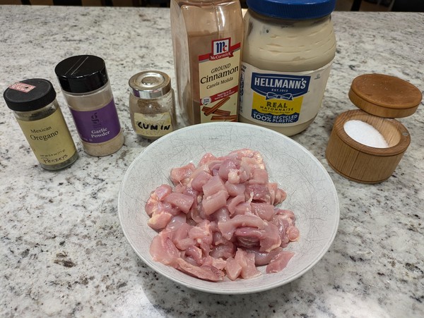 - In medium bowl, mix chicken with mayo2, garlic powder, kosher salt, half cinnamon-sugar mix, and Mexican oregano