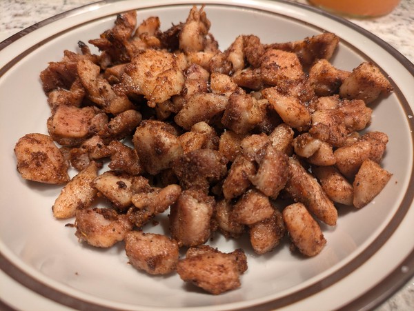Easy, chicken thigh version of carnitas that takes 20 minutes on the stove-top.  Crispy and juicy chicken with warm spices.  Perfect for tacos, tortas, nachos, you name it.