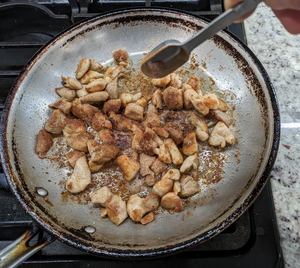 - Once the chicken is golden, add 1 tsp cinnamon-sugar mix and stir. Lower heat to medium and cook for a few minutes, stirring occassionally and gently4