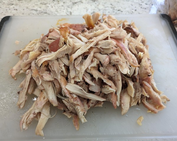 When chicken cools, use forks or your hands to get chicken off bone, keeping the pieces as long as possible and cutting lengthwise. It doesn’t need to be shredded at this stage, but you don’t want large pieces either.