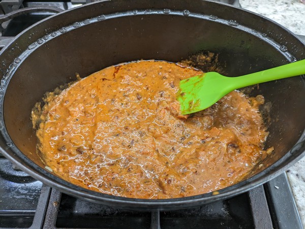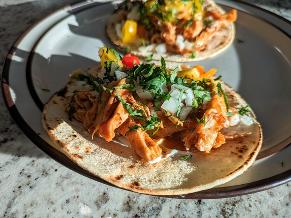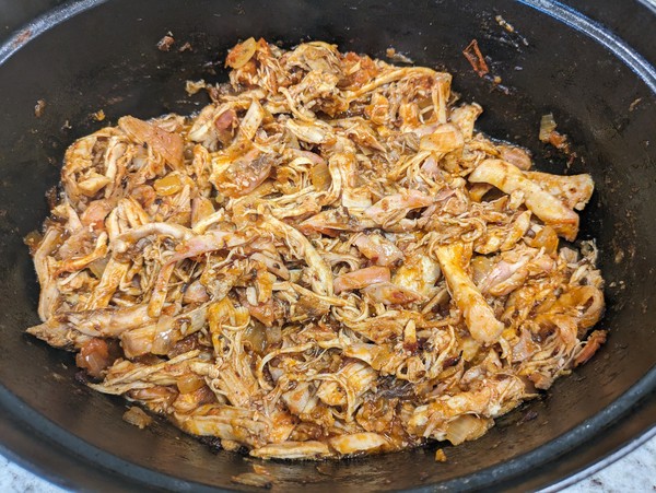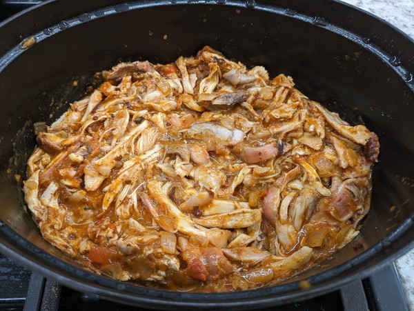Add chicken to sauce and mix well. Cook over low heat for 5-10 minutes, using forks to shred the big pieces. If not serving right away, put dutch oven in warm oven with lid off. Salt to taste and squeeze some fresh lime juice over, right before serving