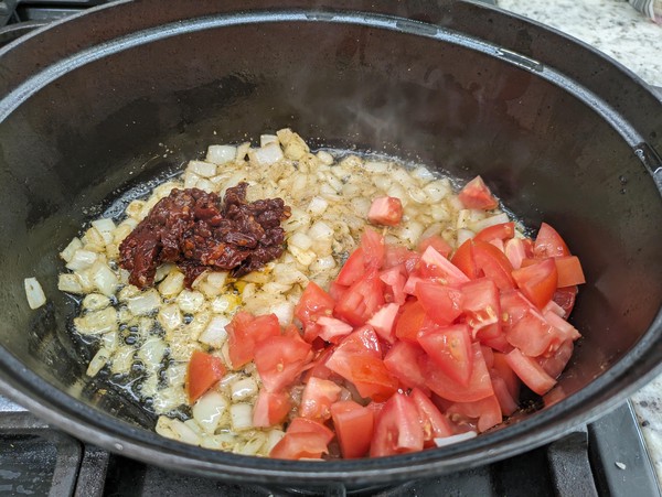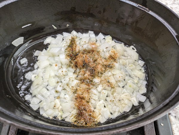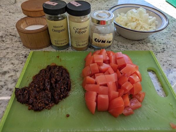 Dice onion, tomatoes, garlic, and Chipotle peppers. Measure or eyeball the Mexican oregano, cumin, and salt.