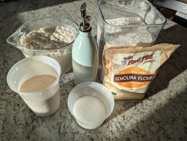 - Flour Mix => Sub in 5-20% whole-wheat, rye, spelt, semolina, whatever. You may need to add more water to compensate, since these flours tend to absorb more water than white flour