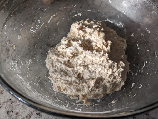 In large bowl, mix ingredients in listed order, using spatula and then switching to a hand, when the flour gets too difficult to mix. Switch between squeezing the dough between your fingers and scooping the bottom and sides to the top, for about a minute. Use butter knife and clean hand to scrape the dough off the other hand. The ingredients should all be well-mixed and the dough will be shaggy and sticky.