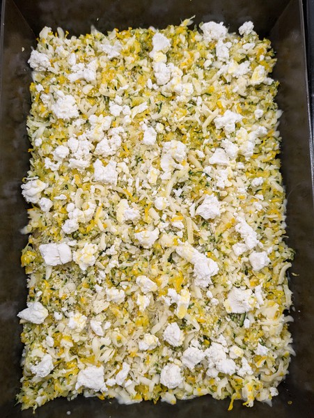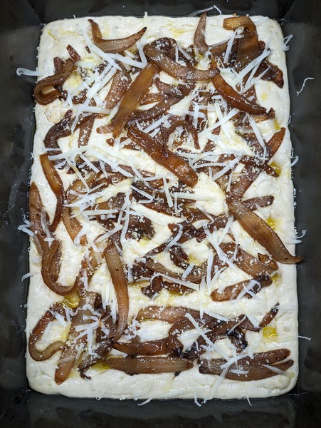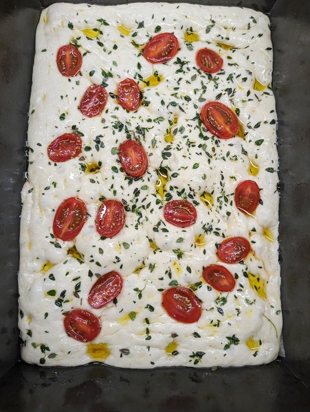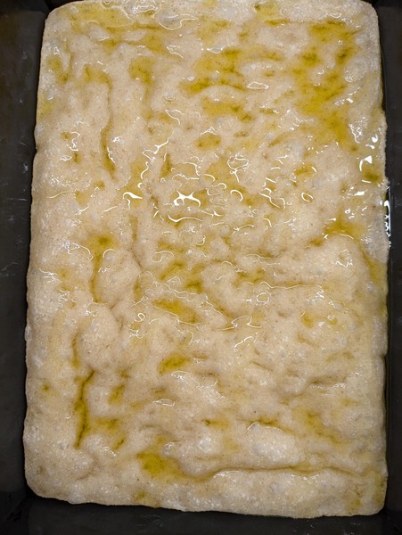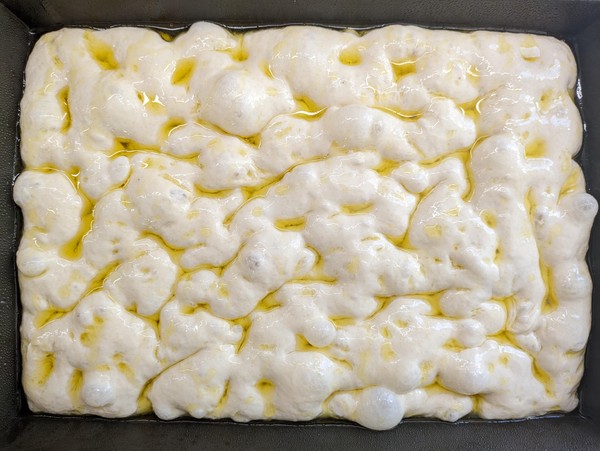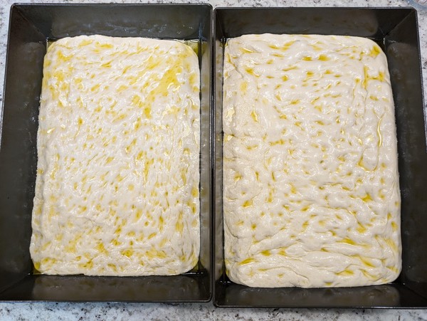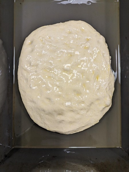 Dividing the dough => dump onto oiled counter and use oily hands to stretch into a rectangle or close enough. This makes it easier to eyeball where to cut with a dough knife (or whatever you have). Use oiled hands to coax the cut pieces to match the pan’s shape.