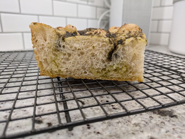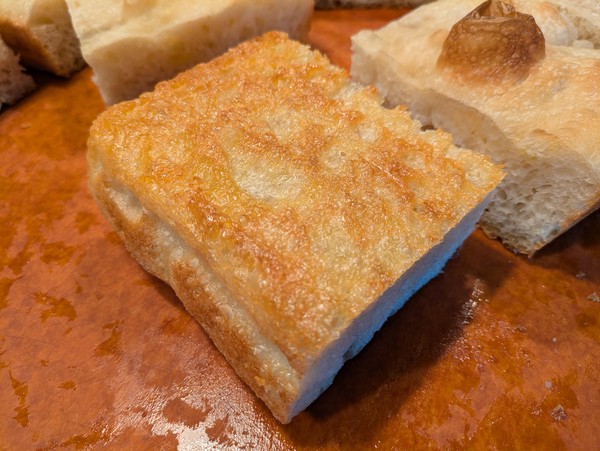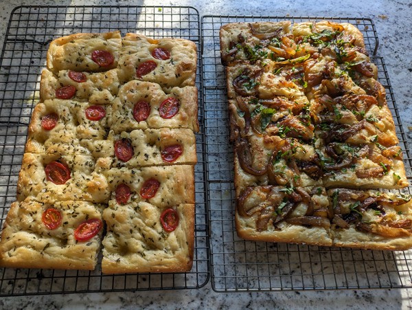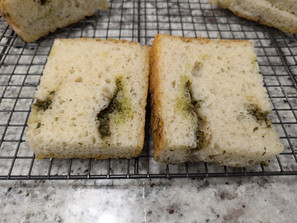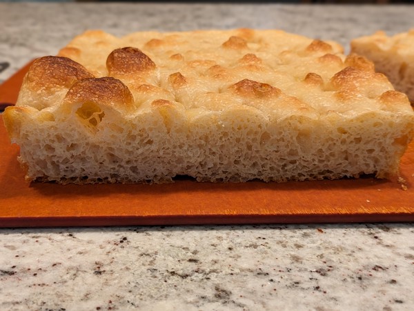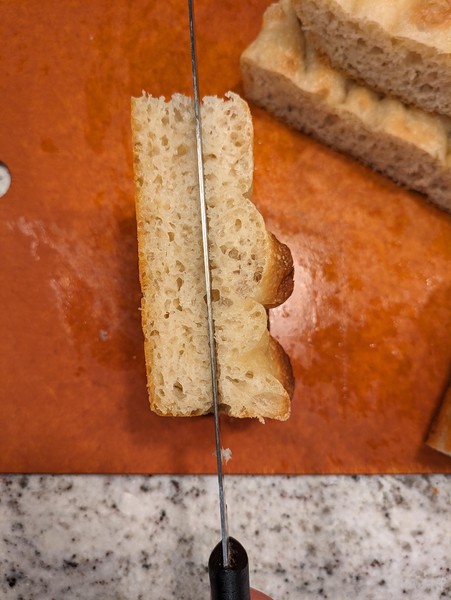 If the focaccia was really bubbly and the crumb is uneven, cut the slices more towards the bottom, so that the top piece retains structure