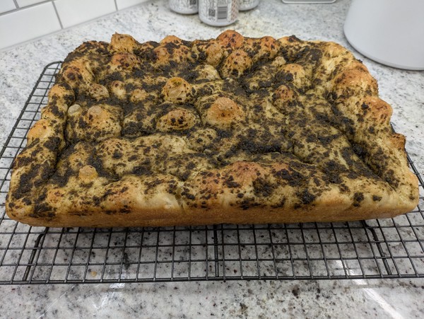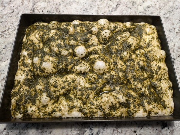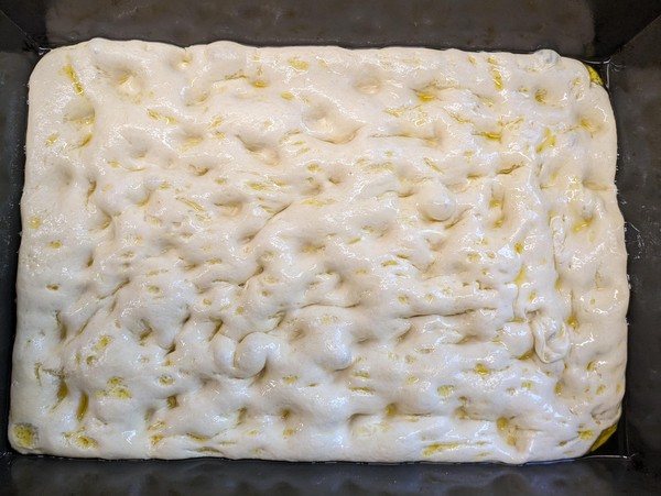 Sauce before rise => if topping with red sauce, pesto, or anything reasonably safe at room temp during the rise, adding a thin layer of sauce on the cold dough is easy and adds a neat effect to the rise. The weight of the sauce creates grooves and dimples for you. Recommended for pesto focaccia and sauce-heavy pizzas.