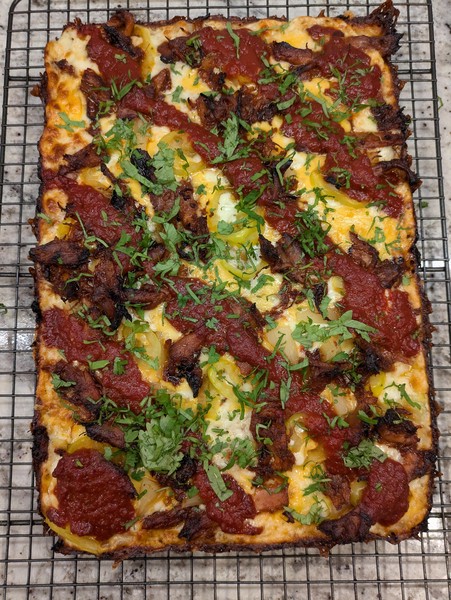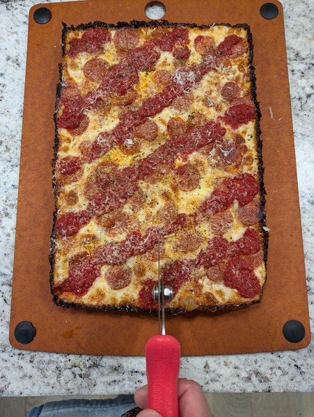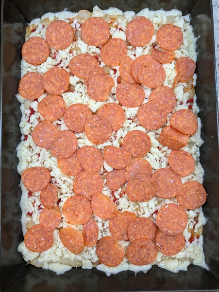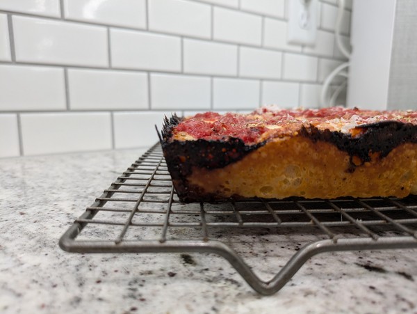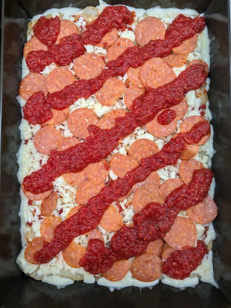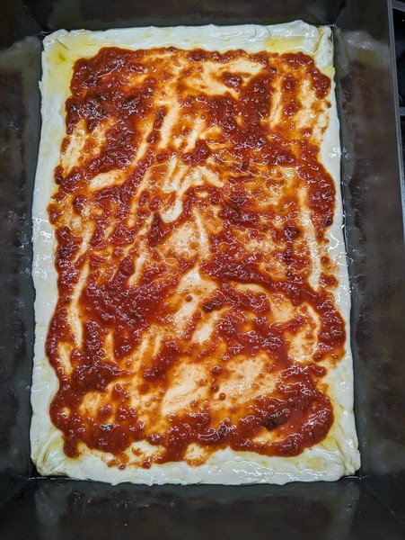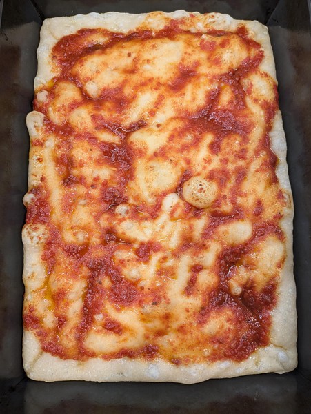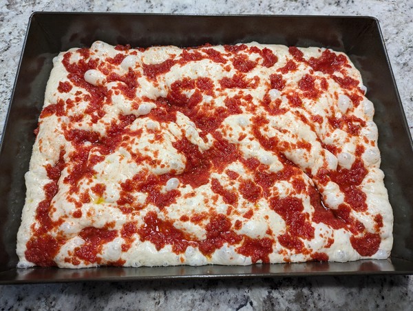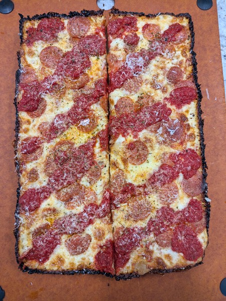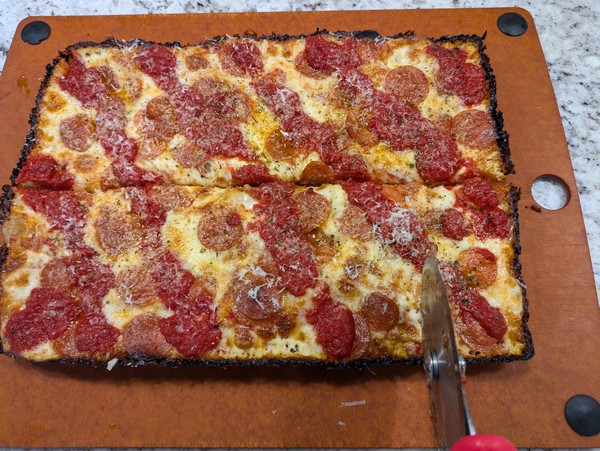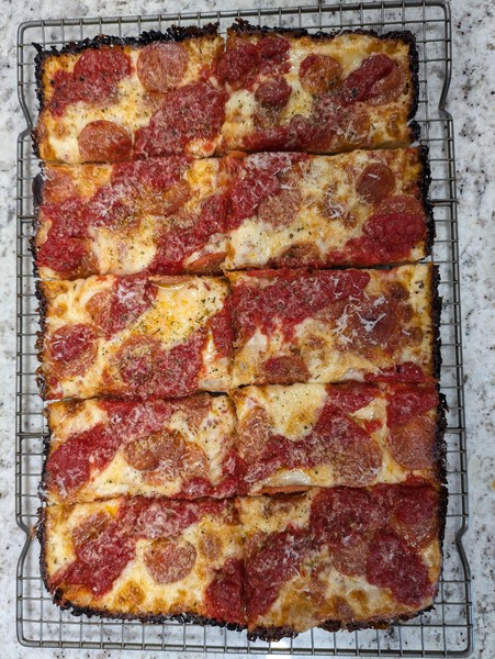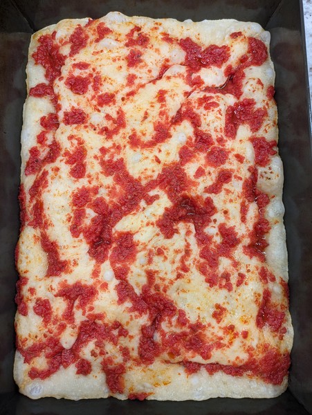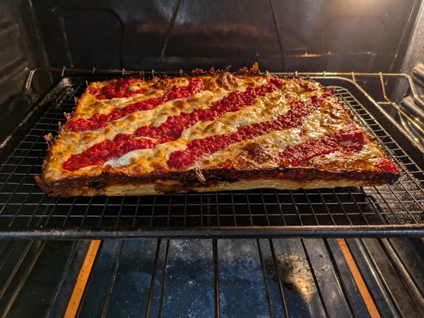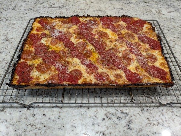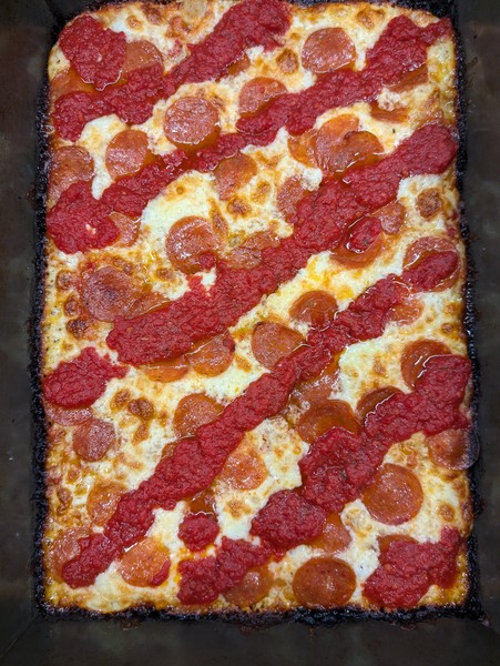 Add thin, first layer of sauce after taking pan out of fridge. Keep covered for the rest of the rise. Move an oven rack to the middle of oven, and set oven to 450°F near end of rise, when the dough is jiggly and the weight of the sauce is creating grooves. Parbake for 7 minutes, then remove. Let cool for 5-10 minutes if you have time. Add a generous layer of mozzarella cheese. If you’re going for Detroit style, cheese should go to the edges and pile a small bit, for the crisp edges. Add layer of pepperoni, as much or little as you want; don’t bother with neat rows and columns since the peps slide around during the bake. Spoon generous second layer of sauce in diagonal stripes. Bake for 13 minutes, rotating 180° halfway through. The goal is a well-done top and golden-brown bottom, but it’s tricky since you can’t see the bottom while it’s in the oven. This make take another 5 minutes, and you may want to turn on the broiler or cover with foil, depending on how the top looks at the 20 min mark (7 min parbake + 13 min bake). Longer bakes are good when using lots of sauce and cheese.