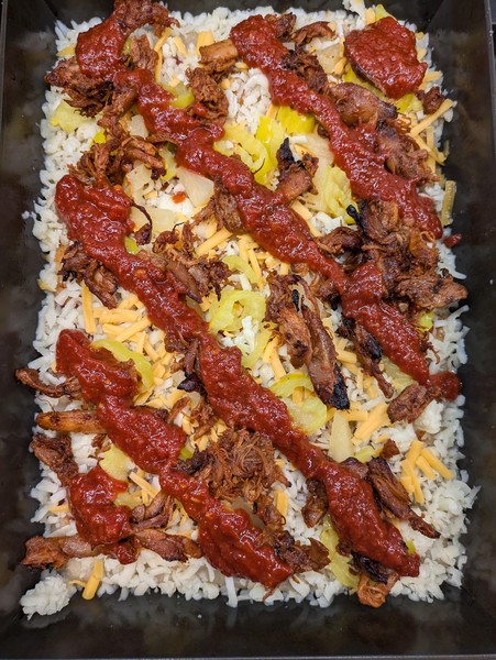 Same flow as the double-sauce pepperoni pizza, just with a mix of red sauce + Korean BBQ sauce. Topped with Korean pulled chicken, banana peppers, pineapple, some cheddar in the mix, and finished with cilantro.e + 13 min bake). Longer bakes are good when using lots of sauce and cheese.
