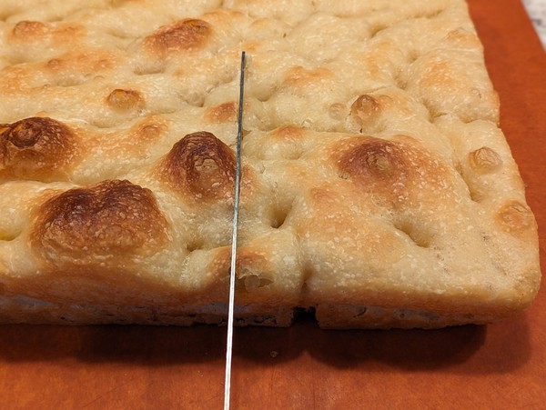 With a fine-tooth knife (ideal) or any serrated knife, gently saw the focaccia in half the long way, and then into sandwich-sized squares or rectangles. Avoid downward pressure; this is easier with a knife than a pizza wheel or cutter.