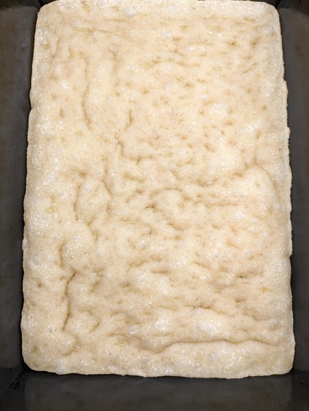 Cover the dough and let it rest for 15 minutes. Then repeating the panning, working to get the thicker middle parts to the corners, and generally evening it out. Oil will pool in the corners, which you can flick under or over the dough to spread back out. Panning usually takes 3-4 rounds, with 15 minute rests in between.