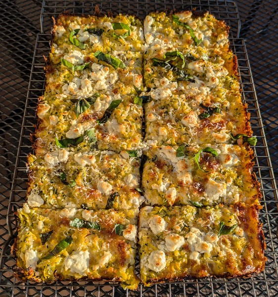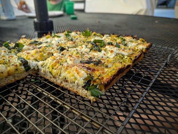 Inspired by Smitten Kitchen’s Summer Squash Pizza, but with parbaked dough and added goat cheese.