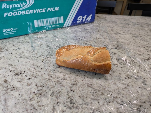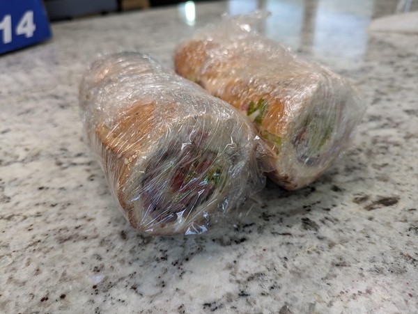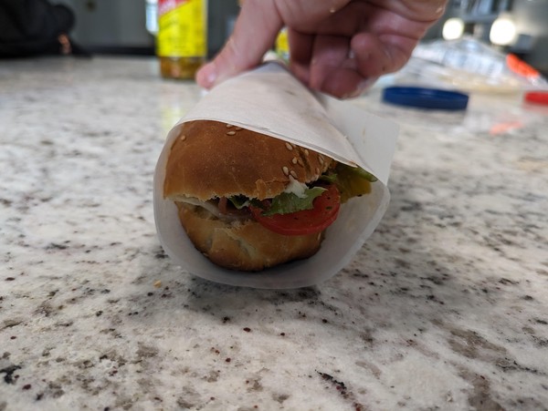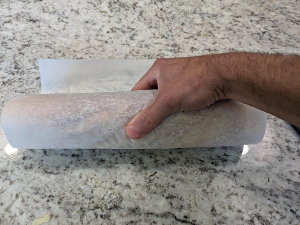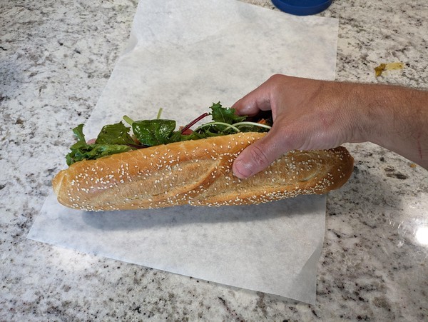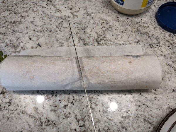 - Close and wrap => move hoagie to bottom of parchment or wax paper that’s long enough to roll it a couple times