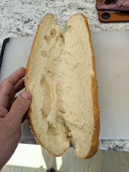 - Slice and open => with the roll on its side, mark a line down the middle, ideally a fine-tooth bread knife. Slice most of the way through, leaving the hinge intact. Gently pry the roll open with your hands. Keep the hinge intact and try not to break the edge where you sliced; both are fragile