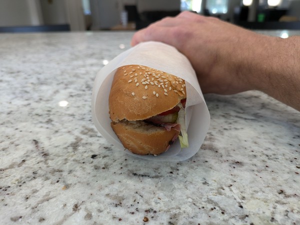 - Use the other hand to pull the top of the paper away, building tension. Use that tension to tightly wrap the sandwich towards the end. Everything should be intact and compressable