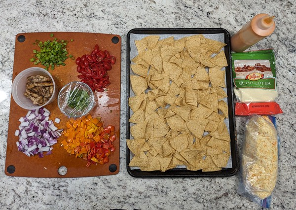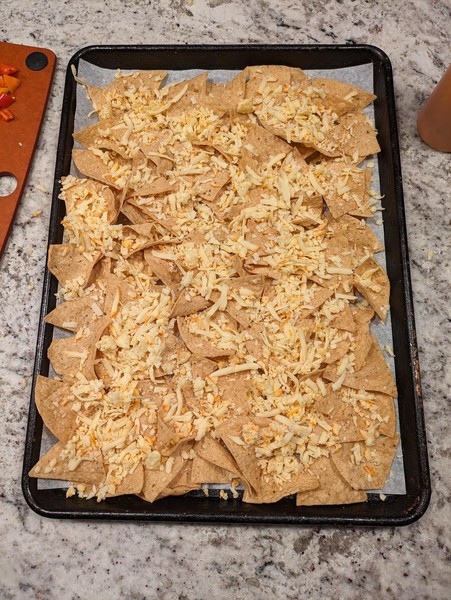 - Spread tortilla chips into single layer on parchment-lined sheet pan. It’s OK if the chips overlap. If the chips have a curved side, face it up, so that the chip is a bowl instead of a table