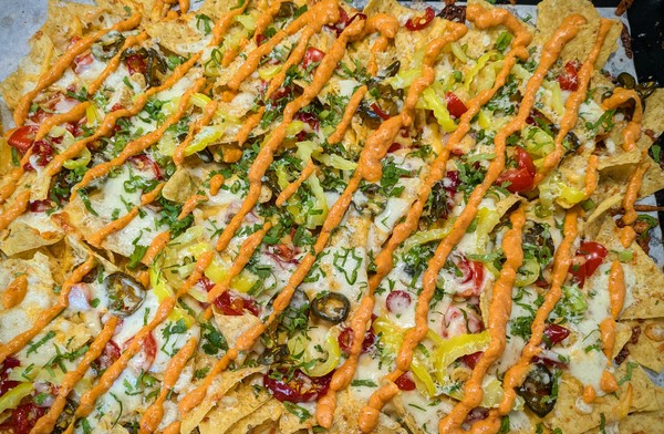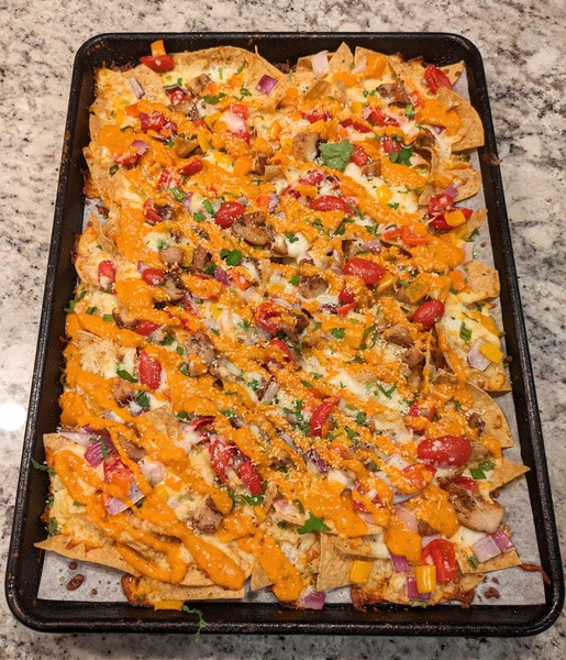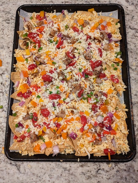 - Evenly layer half the cheese mix on the chips. Add a layer of half the vegetable mix, except for cilantro which should be added after the bake. Repeat with another cheese and vegetable layer