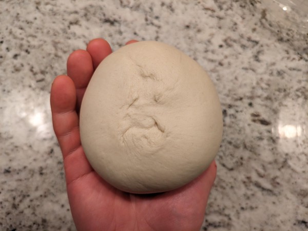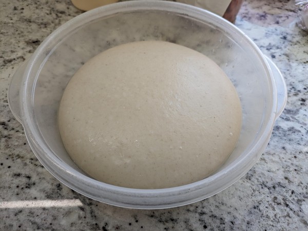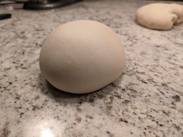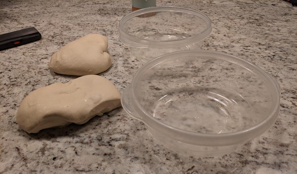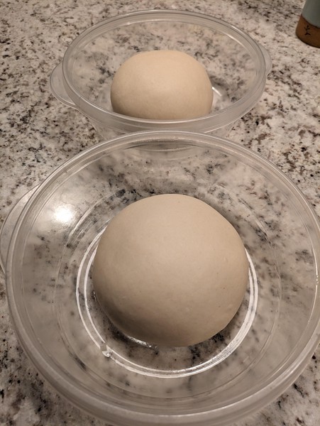 - Grease counter and dough containers. Divide dough into 2 pieces, weighing ~500g each. Shape into tight balls, pinching the bottom to seal if needed. Place into containers seam side down, and move to fridge for 72-96 hours