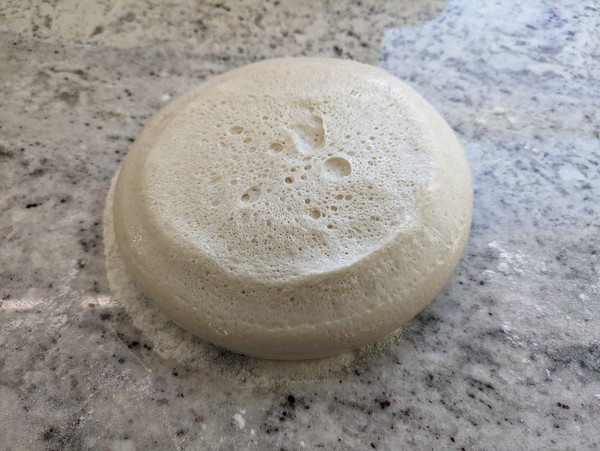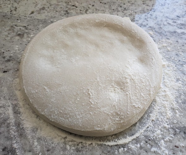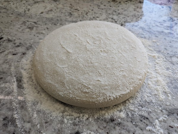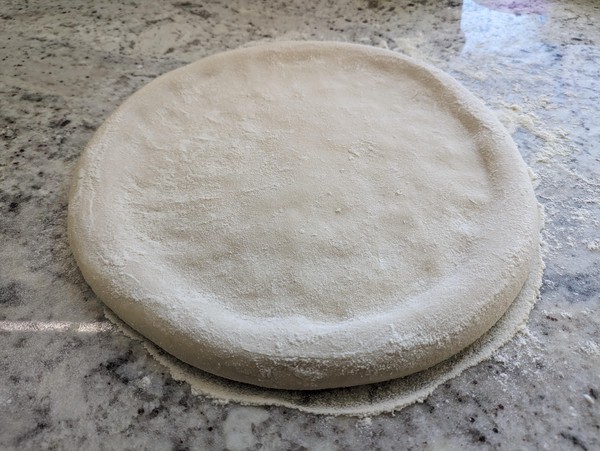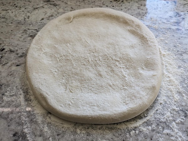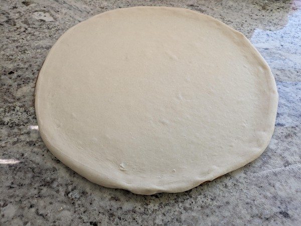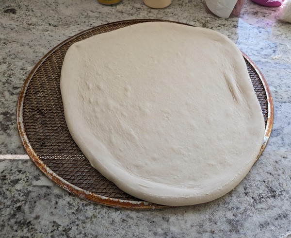 - Stretch => dust counter and top of dough ball with flour. Put container upside-down and tap on counter to release dough ball. Add flour and flip dough so top side is on top. Use finger tips to press dough towards the edges. Don’t press the center too much. Flip and repeat 2 times. Top side should be back on top. Lift dough off counter and toss between your hands while rotating, like in this video, until it’s roughly the size of the screen. Lay onto screen and use both hands to go around and stretch sections to fit the screen. Look for thicker sections and get them stretched to match. Repeat for 2nd pizza