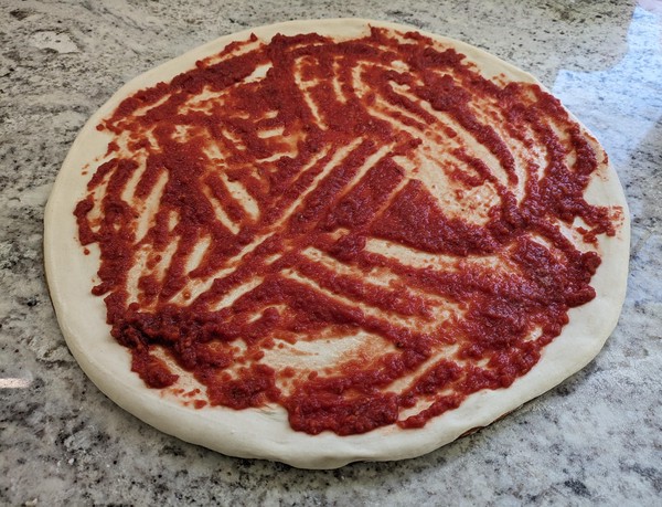 - Dress => pour 1 cup sauce into middle and spread almost to edges, with a spoon or clean hands. The dough is very thin, so work with care. Add relatively-light layer of cheese. You should be able to see the sauce throughout. Top with pepperoni or whatever. Repeat for 2nd pizza