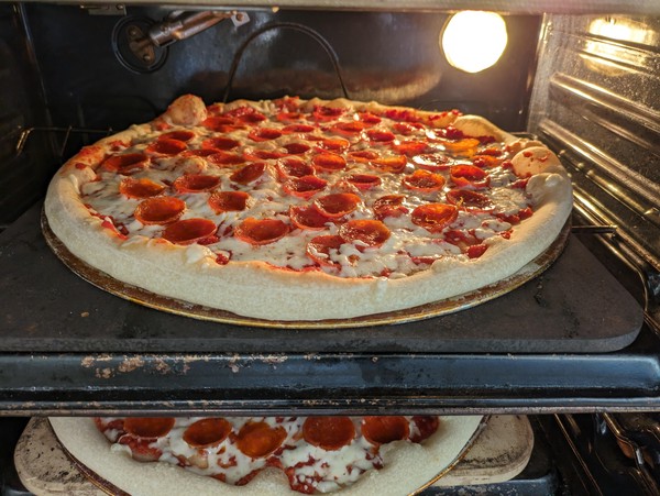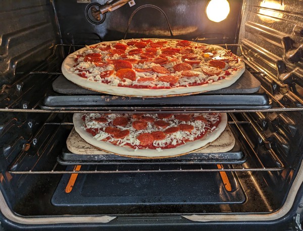- Bake (~7 min) => Move pizza screens to oven, centering on the stones/steels. Bake for 2-3 minutes. Use peel and oven glove to rotate screens 180°. Bake for 2-3 minutes. Slide pizzas off screens, by sliding the peel between them, and using the oven glove to remove the screen. Peek at the bottoms. If the bottoms are done but the tops are not, turn on broiler. Bake for another 1-2 minutes, keeping a close eye, until tops are done.