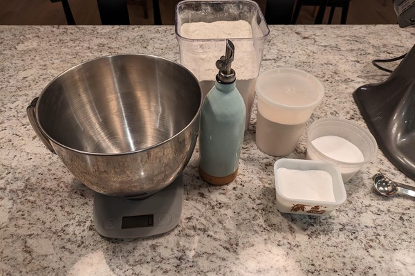 - In mixer bowl, mix water with salt, sugar, and instant yeast. Stir until dissolved. Add flour and stir until mostly combined