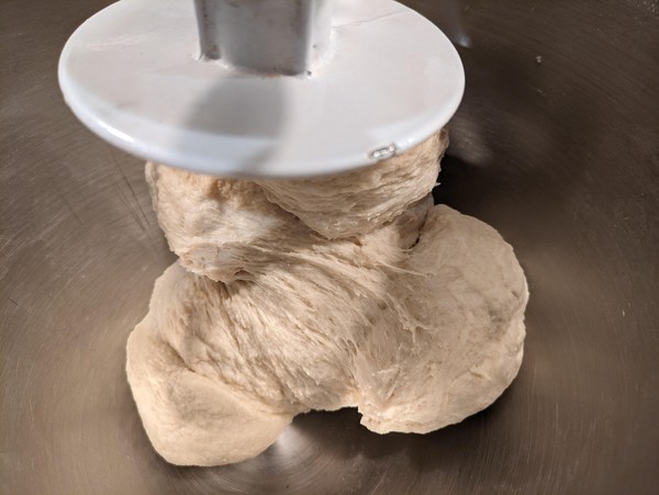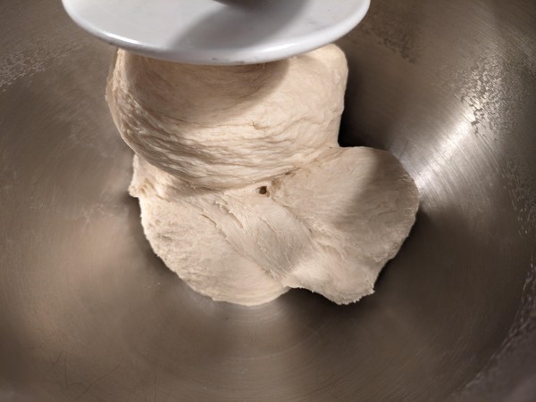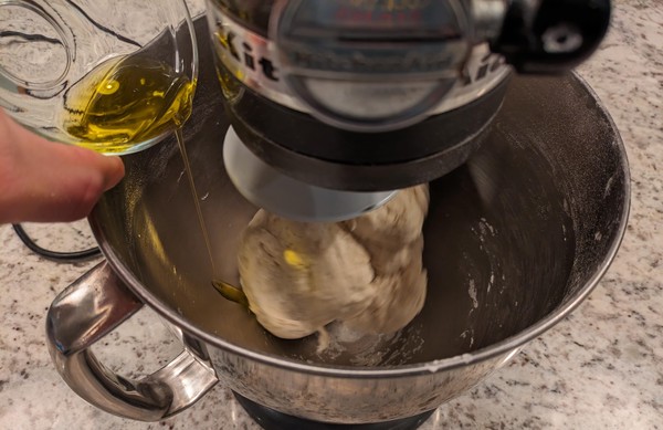 - Fit mixer with dough hook and mix on lowest speed for one minute. Slowly add olive oil, with mixer running. Increase mixer to speed 2 and mix for 5 minutes. Stop mixer and cover with large bag for 10 minutes. Mix on speed 2 for 5 more minutes. Stop mixer, remove dough hook, and shape dough into a ball. Put back into mixer bowl and cover for 15 minutes