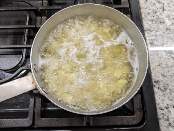 - Boil potatoes. Add 1-2 tsp kosher salt and 1-2 tbsp vinegar to pot, stir, and set to boil. When fork-tender, strain and leave in strainer until mostly done steaming (~5 min)