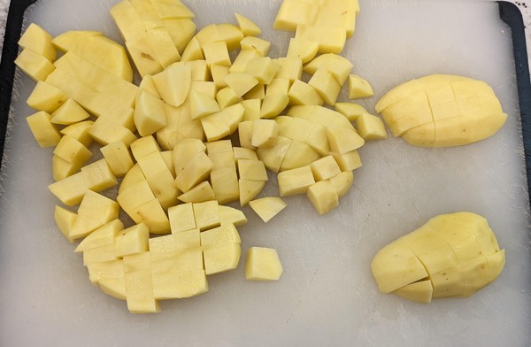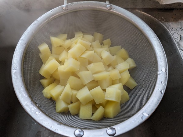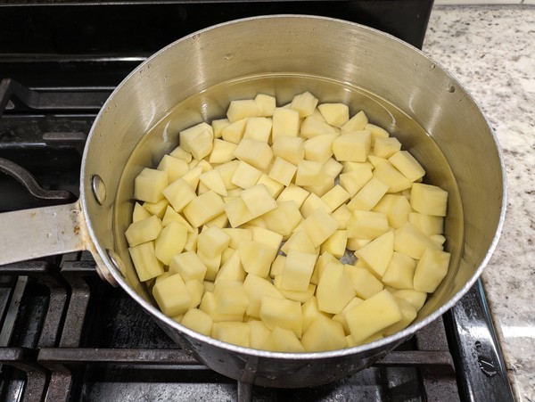 - Peel potatoes and dice into 1/2 inch pieces. Put in pot, rinse with water, and repeat until water runs clear.