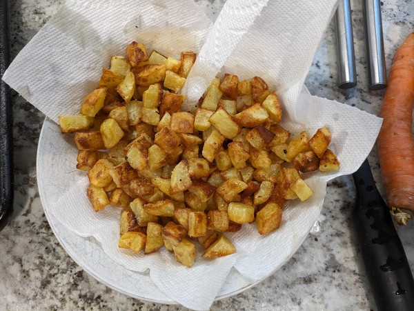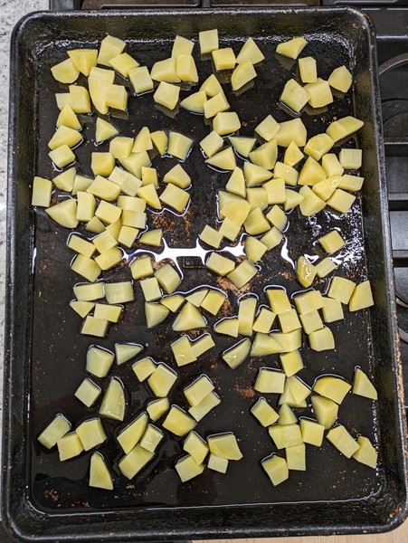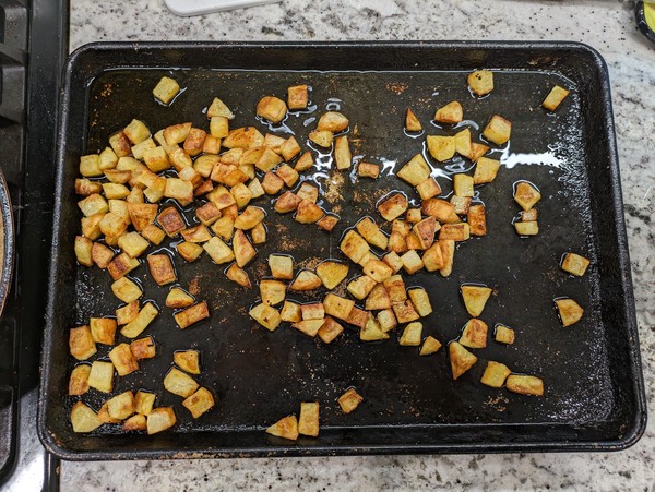- Move cooled potatoes to sheet pan and spread out. Sprinkle with kosher salt and move to oven. Set timer for ~7 minutes, to check the potatoes and flip + rotate them around for an even bake. Use timers to remind you to check the potatoes every few minutes. When they are golden brown, move to a paper towel-lined plate-bowl, then remove paper towel