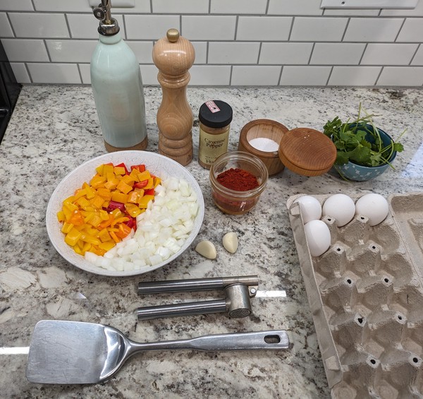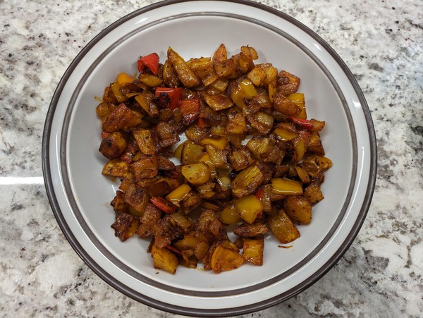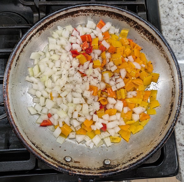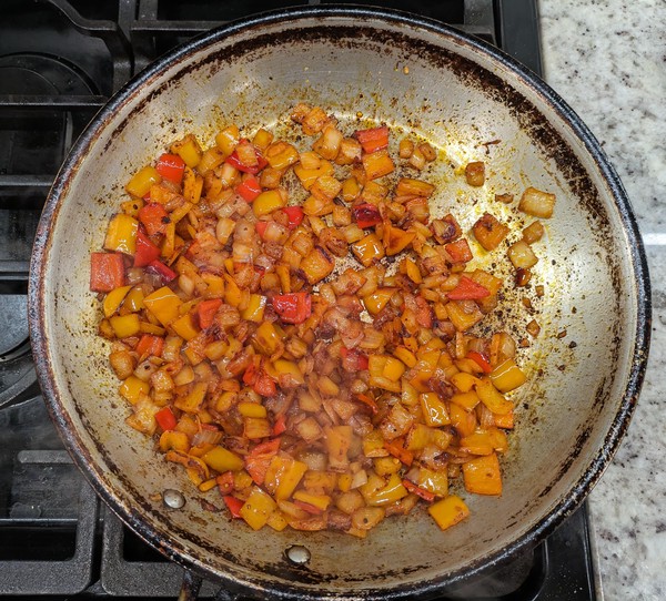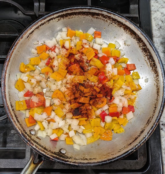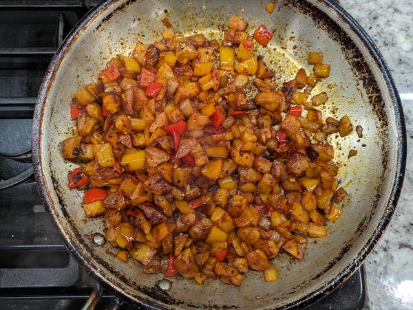 - In parallel, cook the sweet peppers and onions. Set not-teflon skillet over medium-high heat until water skitters across the pan3. Add olive oil, followed by sweet peppers and onions. Layer with kosher salt and pepper and cook for a couple minutes. Add chili powder and cayenne, cook for a few minutes stirring occassionally. Lower heat to medium. Cook until there’s good color and some burnt edges. If mix looks dry, add more oil. If potatoes are behind schedule, cut the heat