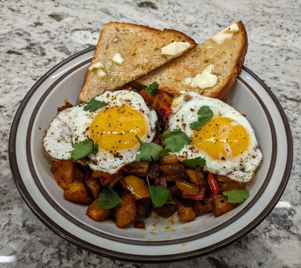 Diner-style hash, with prep done ahead of time. Something in the fridge you need to use up? It can probably go in the hash