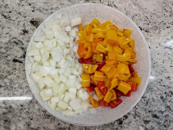 - If not cooking right away, cover potatoes and leave soaking at room temp (few hours) or in fridge (1-2 days). Cover sweet peppers and onion, move to fridge