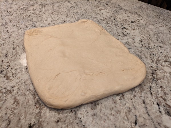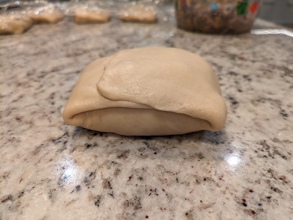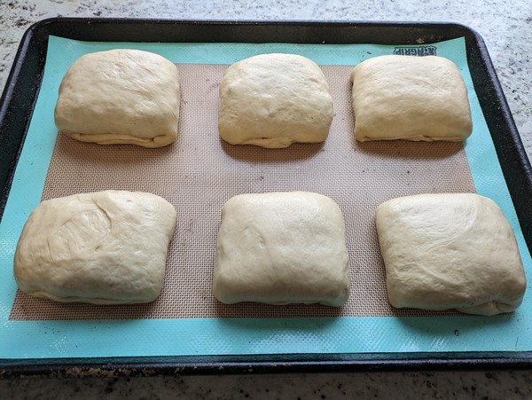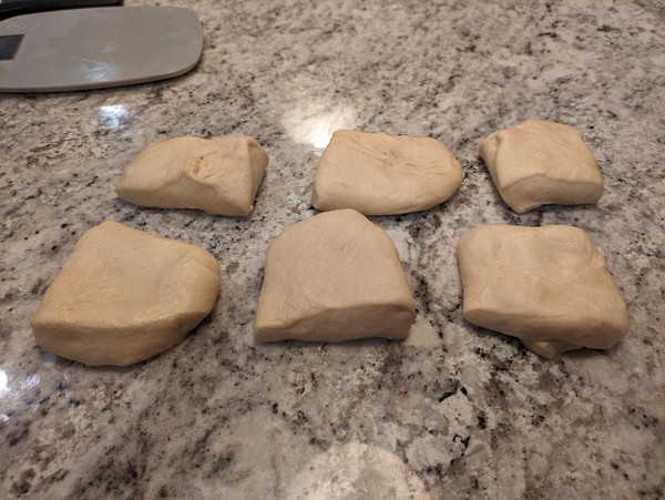 Divide dough => Punch down dough and dump/scrape onto greased counter, and pat down + stretch into a rectangle. Use bench knife to cut 3x4 grid. Each piece should weight 123g if you want to be exact with a scale. Keep dough covered with plastic wrap or spritz with water bottle, to avoid the dough drying out and a skin forming.