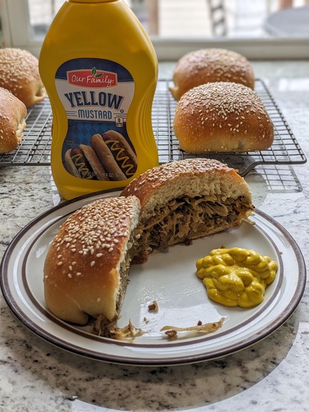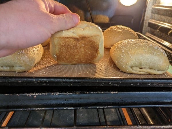 Set oven to 425°F. Beat 1 egg with a splash of milk or water until well-combined. Gently brush egg wash onto runzas. It’s like painting; you don’t want too much paint on the brush. Sprinkle with lots of sesame seeds. Put sheet pans in oven and lower temperature to 375°F. Bake for 10 minutes, then rotate pans 180° and swap upper with lower. Bake for 8-12 more minutes, keeping an eye on the color towards the end. It’s worth peeking at the bottoms; if they’re getting over-done, slide another sheet pan or cookie sheet underneath the sheet pan. Move to cooling rack when runzas are a nice golden-brown color. Serve with cheap yellow mustard.