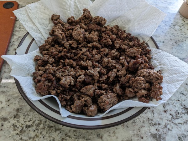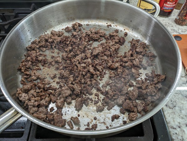 Brown the beef => Heat skillet on medium-high until it passes the water drop test1. Add swirl of oil, then add ground beef. Use metal spatula or spoon to break up. Add pinches of salt. Cook until browned2, stirring occassionally. Remove and drain beef in paper towel lined bowl.