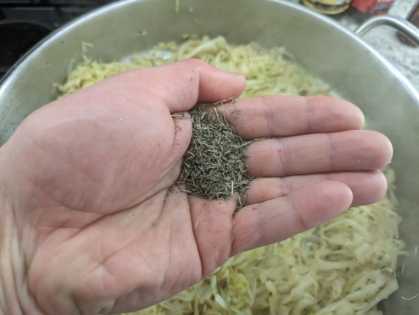 Cook the veggies => With hot pan on medium, add a few tablespoons oil and swirl around. Add cabbage and onions, and stir to coat. Tongs work well here. Add pinches of salt and cook it down for a few minutes. Crush the thyme leaves in your palm before mixing in, along with garlic, and red pepper flakes.