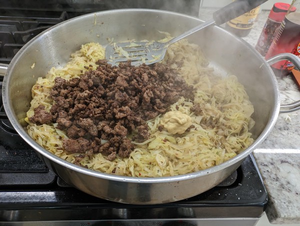 Dial up flavor => Add back ground beef and mix. Then add a spoonful or two of worchestshire, djion mustard, and malt vinegar, tasting as you go. Cook for a few minutes, then turn off heat and move mix to a bowl to cool. It needs to be cool before shaping.