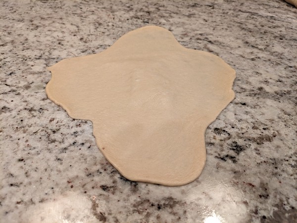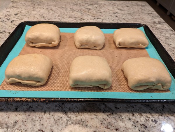 Roll and fill => grease counter and rolling pin1. The goal is to have a plus sign that is thicker in the middle and very thin at the ends2. Put a small bowl on a scale and zero out, then weigh the filling. Use your hands to form the filling into a patty that is the same shape as the runza, and place it on the thicker, middle part of the dough. Do two sets of letter folds, pulling the edges to cover the filling and pressing the edges slightly to seal. The dough should be thin, strong, and elastic. Flip runza onto sheet pan. Repeat for the rest, arranging six runzas per sheet pan. Cover sheet pans and let rise until puffy and passing the poke test3, 1-2 hours depending on room temperature.