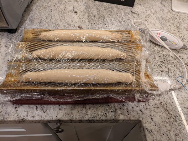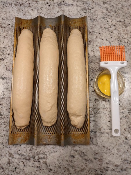 Roll in with your hands => Use your thumbs and pointer fingers, on each side of the top point, to roll towards the bottom. Switch between rolling towards you a little bit and pushing back to build tension. Watch the YouTube video linked above, as this is hard to explain. When the dough is rolled all the way to the bottom, it should feel bouncy and spring-loaded. Flip upside down and pinch the bottom seam closed from end-to-end, like a very wide dumpling. Move to baguette pan right side up. Repeat for the rest, re-greasing the counter every time. Cover pans with plastic wrap and let rise until puffy and passing the poke test2, 1-2 hours depending on room temperature.