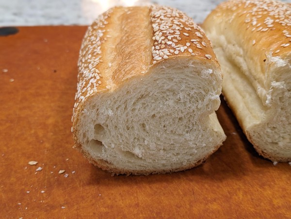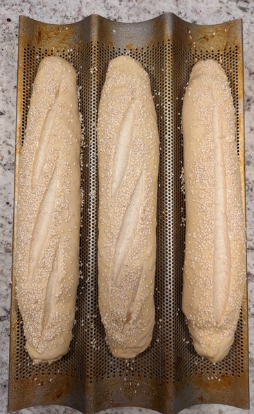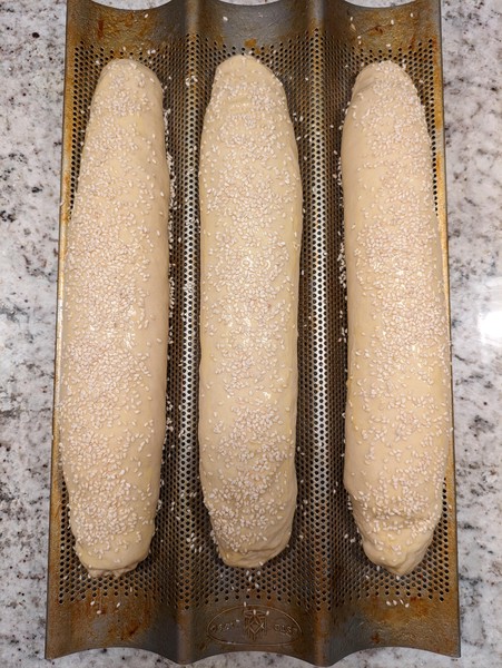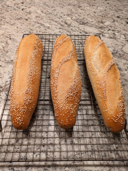 Set oven to 425°F. Beat 1 egg with a splash of milk or water until well-combined. Gently brush egg wash onto hoagies. It’s like painting; you don’t want too much paint on the brush. Sprinkle with lots of sesame seeds. Use a lame or sharp knife to score, either a few times on the diagonal or one long score down the middle (this is easier). Put pans in oven, side-by-side on same rack and lower temperature to 375°F. Bake for 10 minutes, then rotate pans 180°. Bake for 8-12 more minutes, keeping an eye on the color towards the end. It’s worth peeking at the bottoms; if they’re getting over-done, slide a sheet pan or cookie sheet underneath the baguette pan. Move to cooling rack when rolls are a nice golden-brown color.