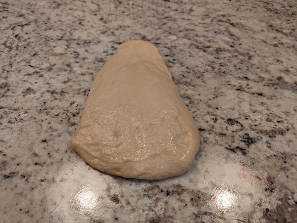 Divide dough => Punch down dough and dump/scrape onto greased counter, and pat down + stretch into a circle. Use bench knife to cut in half, and then each half into thirds. Goal is to get 6 triangular pieces weighing 245g each. Keep dough covered with plastic wrap or spritz with water bottle, to avoid the dough drying out and a skin forming.