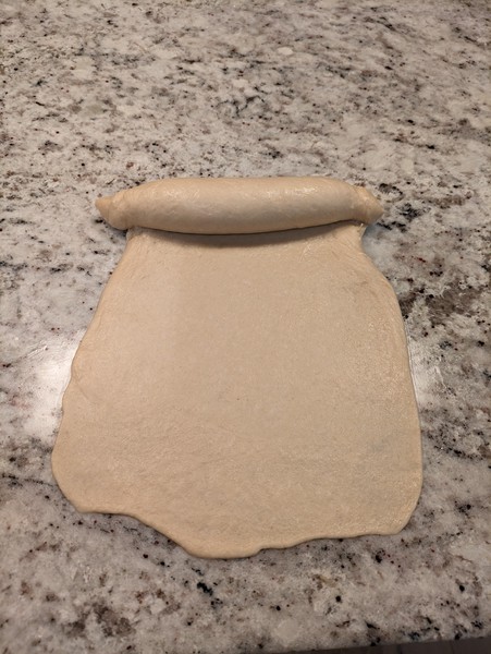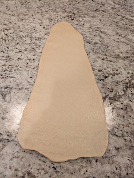 Roll out with rolling pin => grease counter and rolling pin1. Pat dough into triangle shape and use rolling pin to roll it out, ensuring the bottom of the triangle is rolled very thin. The bottom points should be 8"-10" and closest to you.