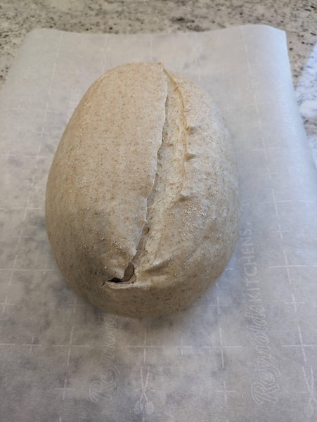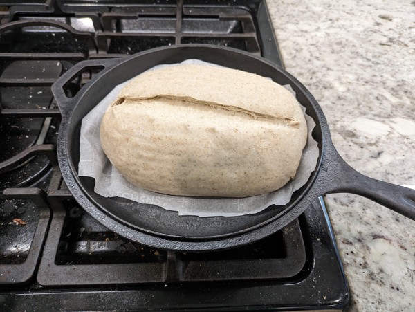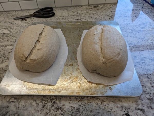 - Load parchment + loaves onto cookie sheet, upside down sheet pan, or pizza peel