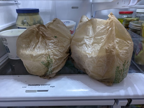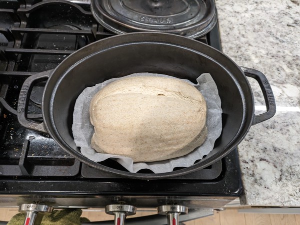 - Drop and center parchment + loaves in dutch ovens, optionally adding a couple ice cubes first