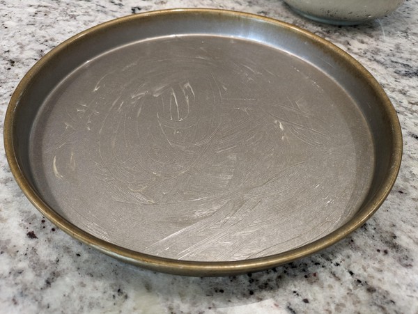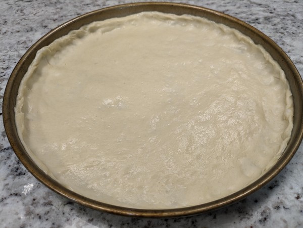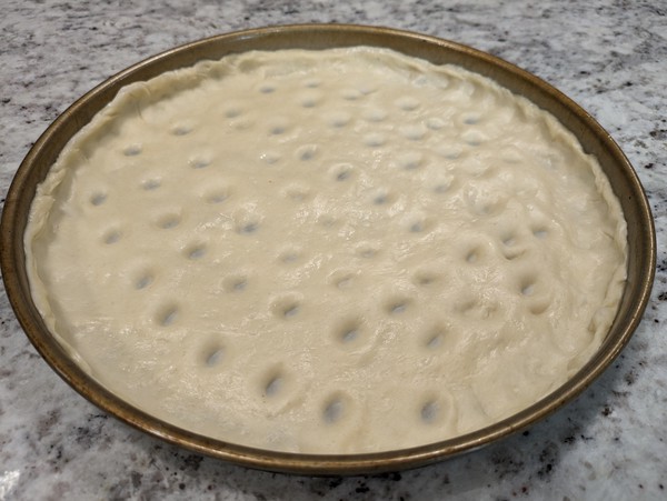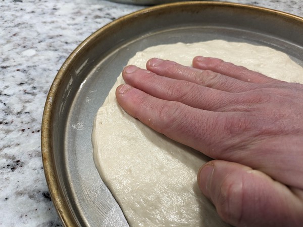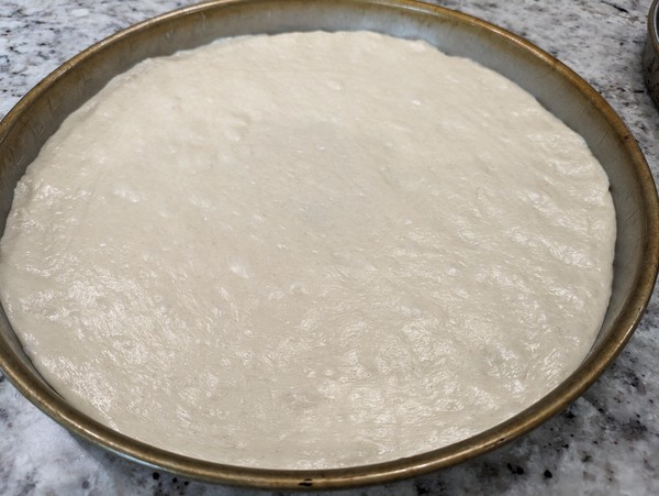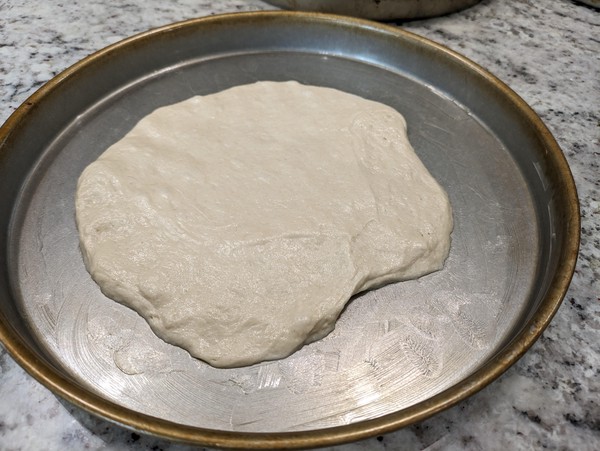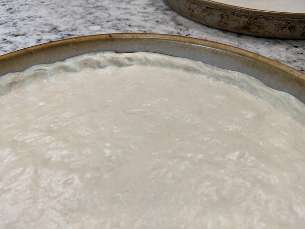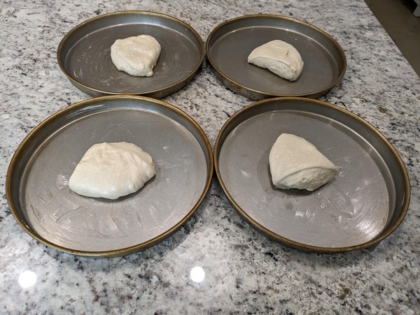 - Late Afternoon => grease pans with butter-flavored Crisco; you don’t need much. Grease counter too. Punch down dough and divide into 4 ~180g pieces, with help from a scale and bench knife. Panning out - the goal is to pan out the dough evenly, and the Crisco acts like a tack. Put dough in center and use the flat of your hand to press and slap the dough mostly downward but slightly outward. No need to be gentle. Start from the center and work your way out, using the other hand to slowly rotate the pan. Laced edges2 or no - if you don’t want laced edges, use your middle 3 fingers to form a small crust up the pan, all the way around. Cover pans with lids that don’t touch the dough; cardboard pieces work well. Leave to rise for another hour or two, until puffy but not bubbly.